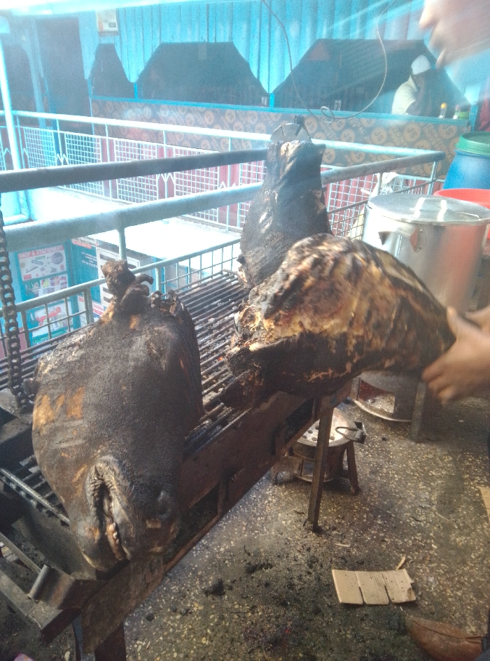 The scene depicts an active outdoor food preparation area, consistent with a street food vendor or *kibanda* in Nairobi, Kenya. Centrally, two large pieces of animal meat are undergoing grilling on a black metal grate over hot embers or charcoal. The meat pieces are dark and heavily charred. The piece on the left is a substantial section, possibly a torso, with an open mouth visible at its lower end. The piece on the right is a large animal head, also extensively charred. A pair of human hands, belonging to an unseen individual, is actively holding and manipulating this rightmost head over the grill. The immediate ground is a stained concrete or tiled surface, littered with dark ash, charred debris, and scattered pieces of light-colored cardboard. The grilling apparatus is supported by a simple metal frame and a small, dark metal stool. In the background, a light blue metal railing is visible, followed by a white wire mesh fence. Behind the fence, a blue corrugated iron structure forms a wall or canopy. Signs are partially visible, including one on the left displaying "SHOP & STATIONERY." Further in the background, several structures with dark, possibly thatched or corrugated roofs are discernible. To the right, a large, lidded metallic pot and distinct blue and red plastic containers are present. A person wearing a white cap is partially visible in the distant background, standing near a patterned fabric element.
