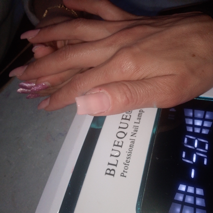 Two hands rest atop a white "BLUEQUEEN Professional Nail Lamp," whose digital display shows "065 -". One hand showcases a square, light pink nail extension. The other hand has manicured nails; one is a light pink with glittery accents. A gold bracelet is visible on one wrist. The skin is fair. The focus is on the newly manicured hands and the nail lamp used for the process.