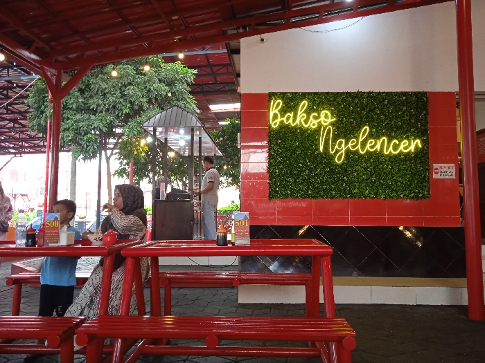 This image depicts a semi-open dining area of a restaurant in Tanjungarum, Indonesia. The foreground features several red wooden tables and matching benches. On the closest visible table, there are multiple condiment bottles (dark liquid, reddish sauce), a white napkin dispenser, a small red ceramic pot, and a promotional stand displaying "500" in white text against a red background. Seated at a red table in the mid-ground, a woman wearing a patterned dress and a brown hijab looks to her left. Next to her, a young boy in a light blue t-shirt and dark shorts is seated, looking towards his right. Partially visible on the far left, another person's arm and clothing are seen. On the right side of the image, a prominent wall features a yellow neon sign spelling "Bakso Ngelencer" in script, set against a rectangular panel of green artificial foliage. This panel is framed by red tiles above and below, with a section of black patterned tiles at the base of the wall. Adjacent to the neon sign, a small white sign with red text and a circular stop symbol is affixed. In the mid-background, behind the seated individuals, a man in a light-colored polo shirt and blue jeans stands near a food preparation or service counter with a dark, sloped roof. Lush green trees are visible in the outdoor background beyond this structure. The overhead structure consists of red metal beams and a white ceiling, from which string lights are suspended. The flooring appears to be dark and textured.
