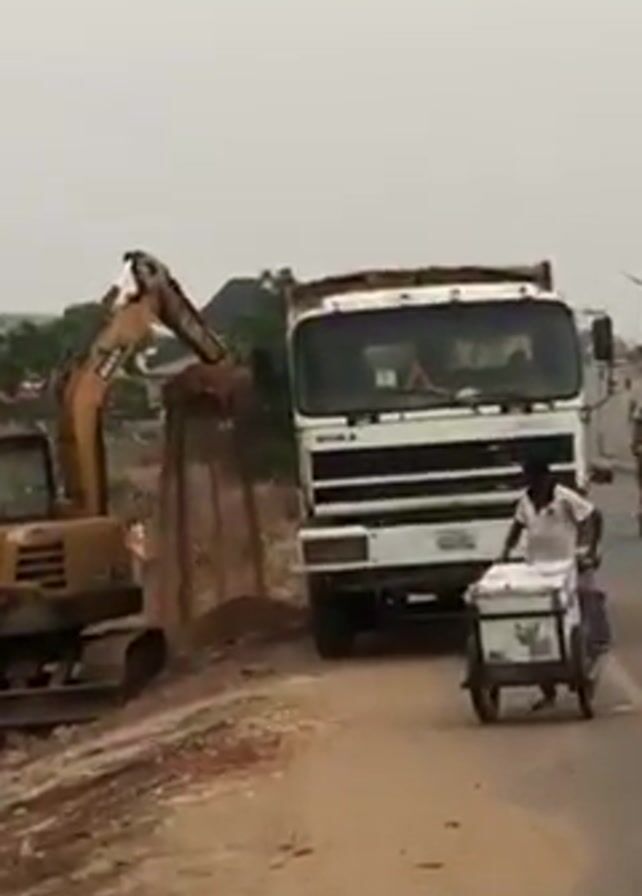 construction site next to a road with an excavator loading dirt into a white truck. The excavator, labeled “SANY” on its arm, is yellow and brown. The truck is labeled “ROKA” on its front. A man pushes a white cart in front of the truck on the road. Cars and streetlights are visible on the road in the background. An advertising sign is visible on the left of the screen. The sky is overcast.