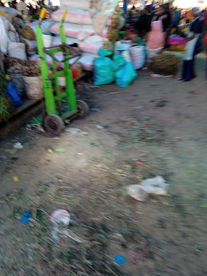 This image depicts a bustling open-air market in Embu, Kenya, observed from a low vantage point. The foreground consists of a dirt ground littered with organic debris, straw, and various discarded plastic items, including small blue and transparent bags. Two bright green hand trucks, equipped with yellow handles and small wheels, are positioned prominently on the left, resting on the uneven ground. In the midground, numerous sacks of varying sizes and colors are stacked, some appearing to contain produce such as tubers or vegetables in open containers. To the right of these sacks, two prominent light blue plastic bags are placed on the ground next to a large, irregularly shaped mound of brown, dried vegetation or herbs. The background is blurry but reveals multiple individuals and additional market stalls. Among the discernible figures, one person on the far right wears a dark blue garment and a white apron, standing near stacked goods. To their left, another individual is visible in a light pink apron. Other indistinct figures are present throughout the background, indicating an active market environment. The scene is illuminated by natural daylight.
