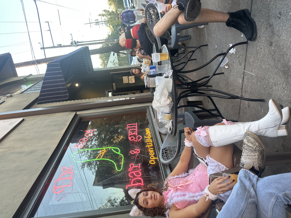An outdoor scene is depicted on the sidewalk patio of "The Boot bar & grill" in New Orleans, United States. The establishment is identifiable by prominent pink and green neon signs in the large front window, displaying "The Boot", a boot graphic, "bar & grill", and "opentill6am". In the immediate foreground, a female with curly brown hair is seated on a dark grey plastic patio chair. She wears a pink and white "cat girl" costume, consisting of a pink corset with white fur trim and bows, a white ruffled mini-skirt, white knee-high boots with pink bows, white wrist cuffs, and a white cat-ear headband. She holds a clear plastic cup containing an amber liquid and is looking directly at the viewer. To her left, the legs of another individual in blue jeans and dirty white sneakers are partially visible. A round, dark metal patio table stands between the foreground subjects and the building. It is cluttered with multiple clear plastic cups containing amber beverages, a plastic water bottle, and crumpled white paper/plastic debris. Several dark grey plastic chairs surround this table and another similar table further back. At the rear table, several individuals are seated. One person, with their back partially to the camera, wears a red fez and a dark shirt. Another female with dark hair is seated opposite them. In the background, a woman with long dark hair, wearing a red top and patterned skirt, is seen standing near the tables. Beyond the patio, a bustling street scene includes utility poles, power lines, and distant pedestrians and vehicles. The lighting suggests late afternoon or early evening.