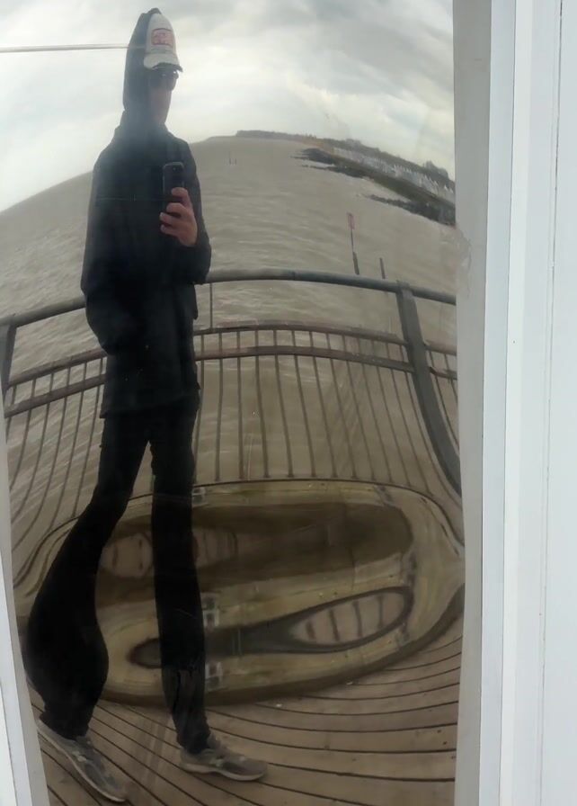 distorted reflection of a person standing on a wooden pier with a metal railing, visible in a mirrored surface set within a white wooden frame. The person is dressed in dark clothing, wearing a cap and sunglasses, and appears to be holding a mobile phone. Beyond the railing is a body of water under a cloudy sky, with some structures visible on the distant shore. The reflection is warped, particularly the boardwalk surface, creating a funhouse mirror effect. The camera then focuses on the white frame around the mirror.