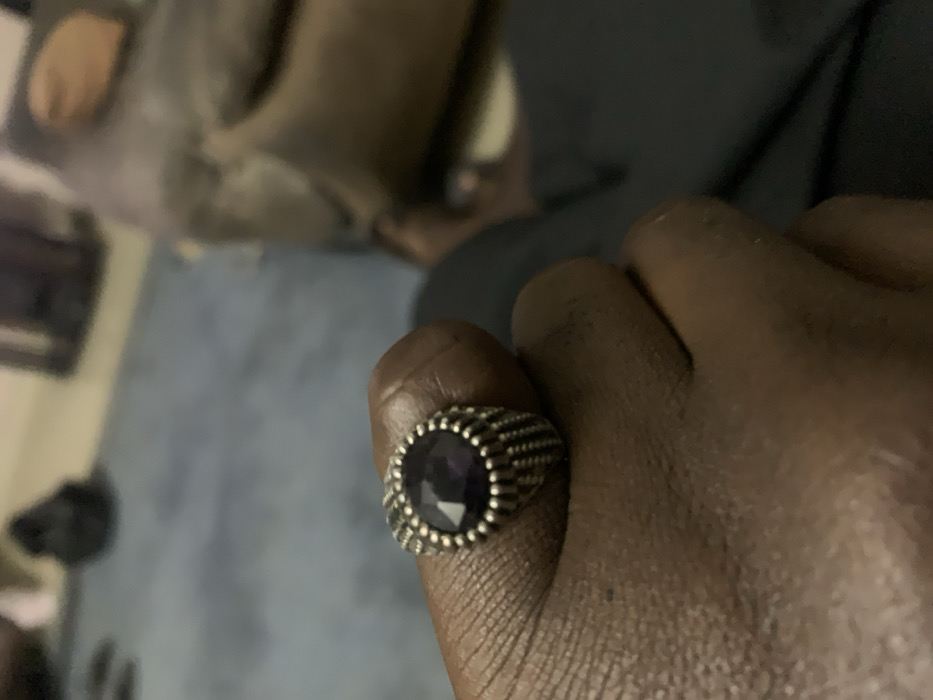 A dark-skinned hand is prominently displayed, wearing a large, ornate silver ring on the index finger. The ring features a dark purple gemstone, cut with facets that reflect light. The ring's band is textured with a ridged pattern. The hand appears relaxed. The background includes blurry elements of a room with furniture and carpeting. The overall image is slightly off-kilter due to the angle of the shot.