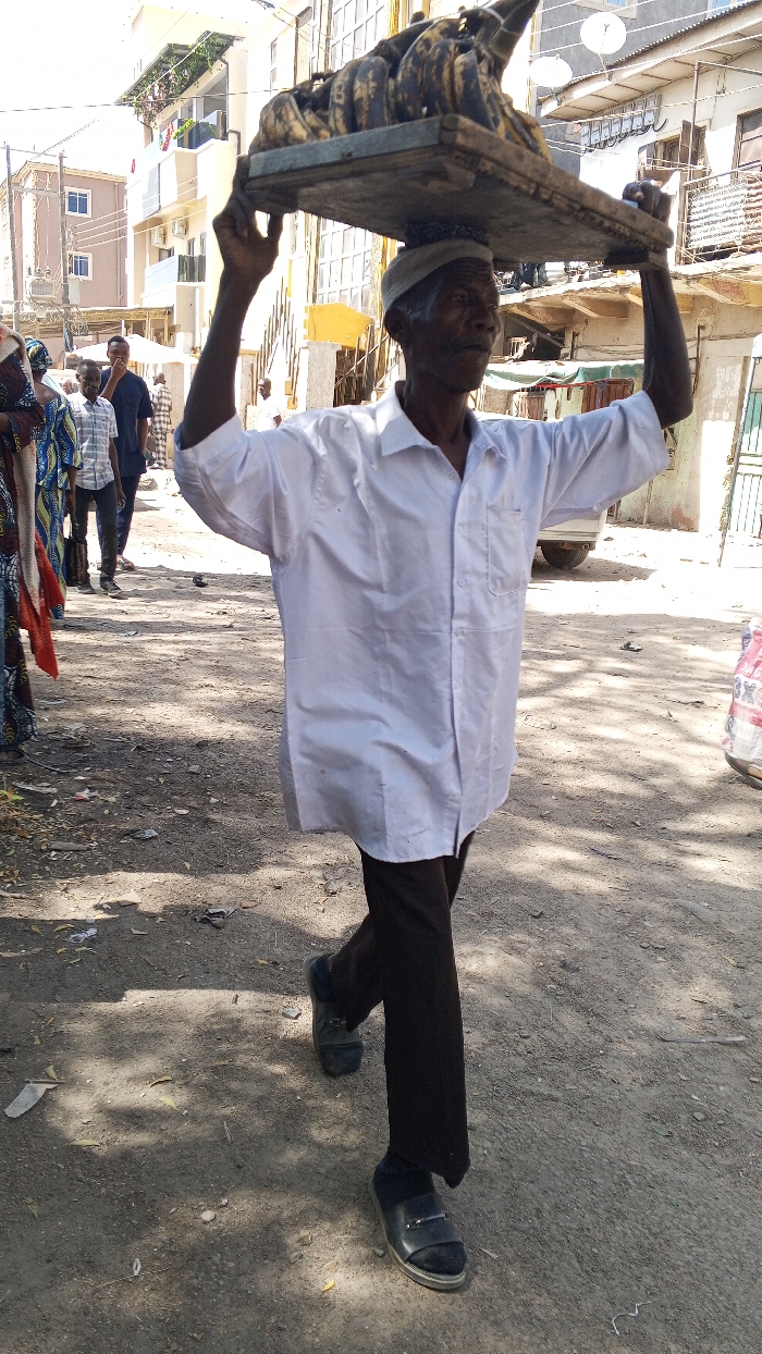 An adult male is observed walking forward on an unpaved, dirt street in Sabon Gari East, Nigeria. He is carrying a rectangular wooden tray laden with approximately ten to twelve bunches of ripe bananas on his head, supported by both hands raised above shoulder level. He wears a white collared short-sleeved shirt, dark trousers, a light-colored cap, and dark open-toed shoes over dark socks. His skin is dark, and facial wrinkles are visible. In the background, multiple individuals are present, some partially obscured; one person in a colorful patterned garment is on the left, and another male in a light shirt is in the mid-ground. Multi-story buildings with balconies and satellite dishes line both sides of the thoroughfare. The scene is outdoors under strong daylight, with visible shadows on the ground and scattered debris.