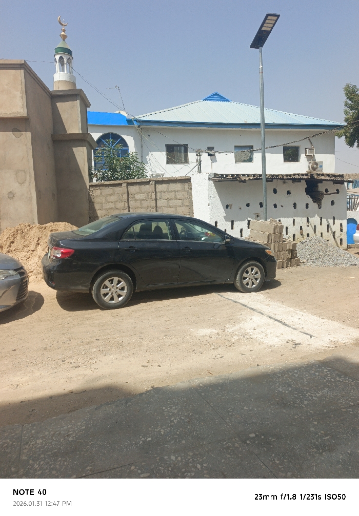 The image displays an outdoor, sunlit street scene in Kofar Ruwa, Nigeria, under a clear sky. The ground consists predominantly of unpaved, light brown earth, with a partial concrete-paved section in the immediate foreground. On the left, an unrendered light brown building is partially visible, adjacent to a large pile of light-colored sand. Above this structure, a white minaret with a green dome and a golden crescent moon finial is prominent. A black sedan is parked facing right on the dirt road in the midground, with the front bumper and fender of a lighter-colored vehicle partially visible on the far left, obscuring part of the black sedan's front. Behind the black sedan, a low concrete block wall runs horizontally, separating the unpaved area from a two-story white building. This building features a light blue hip roof, multiple rectangular windows, and a distinctive arched window on the first floor. An external air conditioning unit is mounted on its wall. To the right of the black sedan, a stack of concrete blocks and a small pile of gravel are present on the ground. A tall metal pole equipped with a solar-powered LED street light fixture stands upright to the right of the black sedan, positioned in front of the white building. Overhead wires are visible crisscrossing in the upper left portion of the frame. No individuals are present in the scene, and no explicit actions or interactions are depicted.