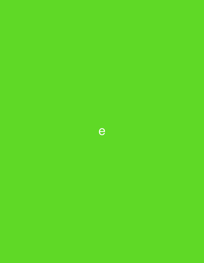 A lime green background features a small, lowercase "e" in the center. The letter is white, providing contrast against the vivid green. The "e" is simply styled, without any apparent embellishments. The composition is minimalist, emphasizing the letter against the field of color.