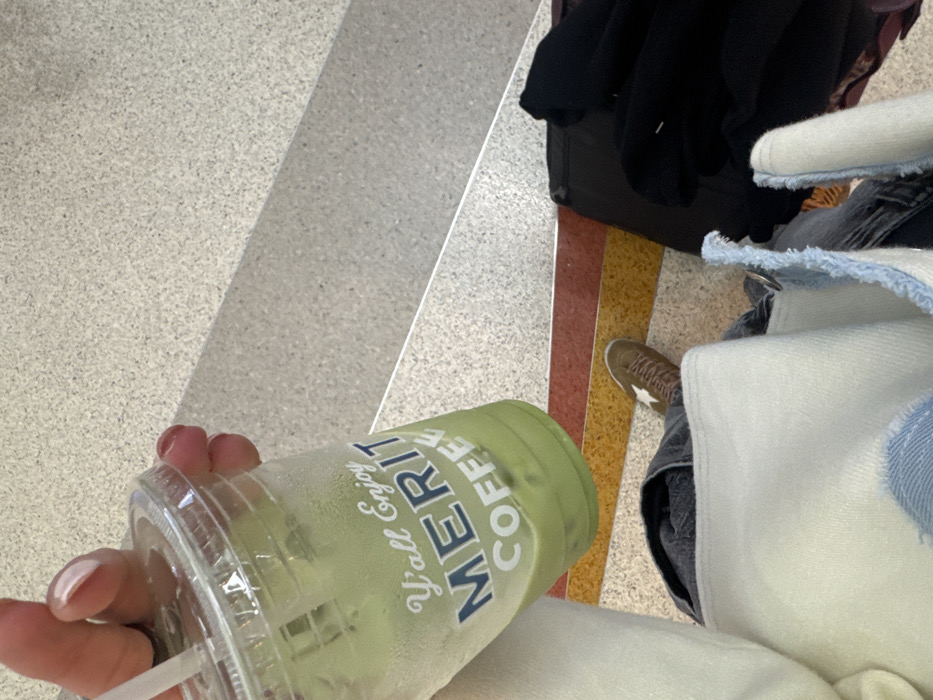 A hand holds a clear plastic cup with a green drink and straw. The cup is labeled "MERIT Coffee. Y'all Enjoy It." Beside it are the legs of a person wearing jeans, a white blanket with blue trim, and an olive green shoe with a white star. Nearby is a black suitcase. The scene unfolds on a speckled floor with colored stripes.