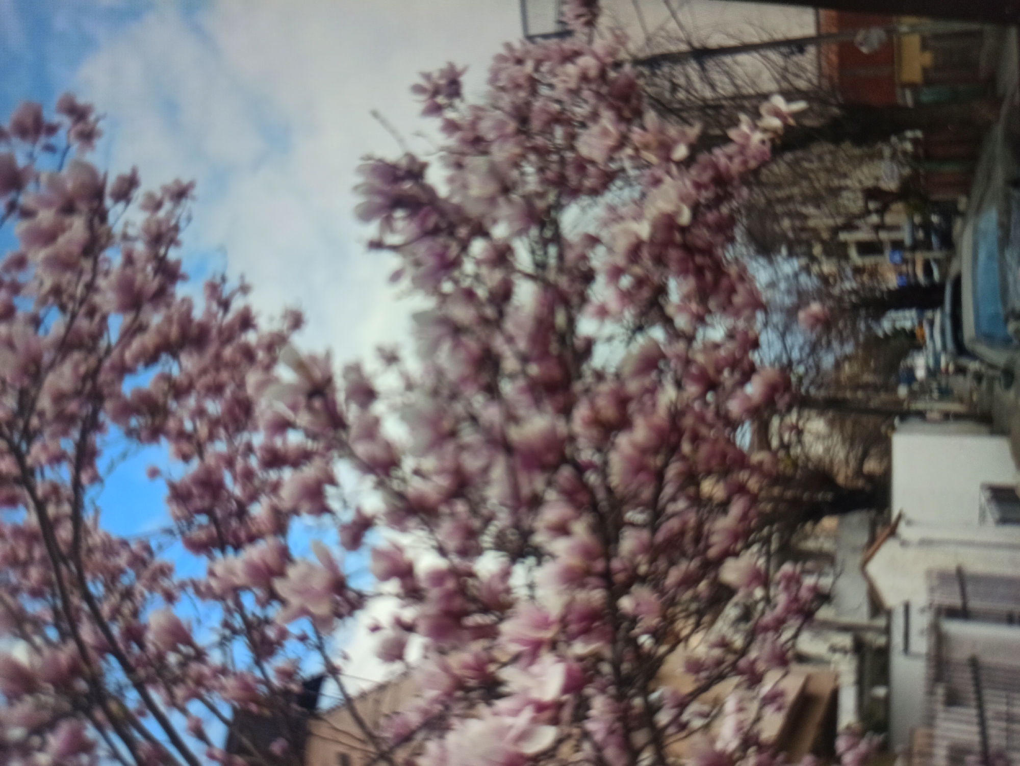 A blurred image depicts an urban street scene in Vozdovac Urban Municipality, Serbia, under a partially cloudy blue sky. The upper and mid-ground are predominantly filled with the dense, light pink and white blossoms of multiple trees, consistent with magnolias in bloom. Below the floral canopy, a paved street extends into the background, flanked by multi-story residential buildings and numerous parked passenger vehicles. Visible foreground elements on the left include a portion of a building, a white perimeter wall, and a dark metal fence. The entire scene is out of focus, resulting in indistinct details.