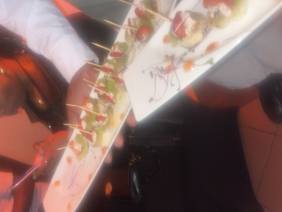 The image depicts an indoor scene in Nairobi, Kenya, illuminated by warm, reddish-orange ambient lighting. Two white, rectangular plates of canapés are prominently featured. The upper plate, held by a person wearing a white long-sleeved shirt, displays approximately 11-12 individual canapés. Each canapé consists of a light-colored base, topped with a green layer (possibly kiwi or avocado), a pinkish spread, and small red garnishes, all secured with a wooden toothpick. The plate is further adorned with decorative drizzles of orange/red sauce and thin purple microgreens. A second, identical plate of canapés is partially visible in the lower right foreground. In the upper left background, a portion of another individual is visible, including dark hair and a dark garment, with what appears to be a hand holding an object. A dark, reflective surface, likely a table, occupies the mid-ground, on which an indistinct dark object rests. The primary action is the presentation of these prepared food items.