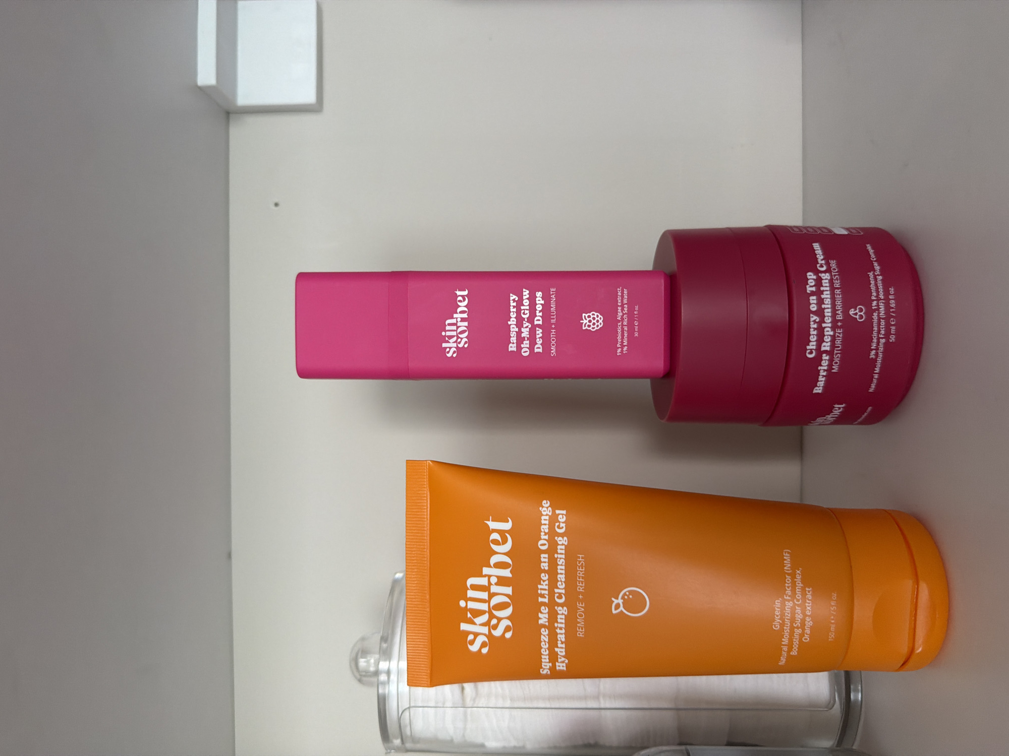 close-up of three cosmetic products on a white surface. The products, all under the brand "Skin Sorbet", are arranged vertically. At the bottom is an orange tube of "Squeeze Me Like an Orange Hydrating Cleansing Gel". Above it is a pink tube of "Raspberry Oh-My-Glow Dew Drops" laying horizontally, and a red container of "Cherry on Top Barrier Replenishing Cream". The background appears to be an off-white wall or interior space, possibly a bathroom or storage area. There are no visible signs of Dragichevo, Bulgaria, nor are there any people depicted in the image.