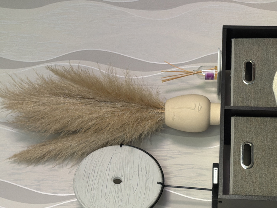 The image displays an interior decorative arrangement located in Interlomas, Mexico. A wall covered with light-toned wallpaper, featuring undulating patterns in shades of grey, beige, and white, serves as the background. In the foreground, a black modular shelving unit is visible, containing at least two grey fabric storage bins equipped with silver-colored oval handles. Upon the shelving unit, from left to right, are several objects. A light grey, circular disc with concentric lines and a central aperture rests on a black metal stand. Adjacent to it, a beige, matte-finished ceramic vase, adorned with a minimalist facial outline, holds a dense bouquet of dried, light brown pampas grass plumes. To the right of the vase, a clear glass diffuser bottle filled with purple liquid and containing multiple light brown reeds is placed on a small, white, elliptical tray. No individuals, actions, or direct interactions are present in the scene.