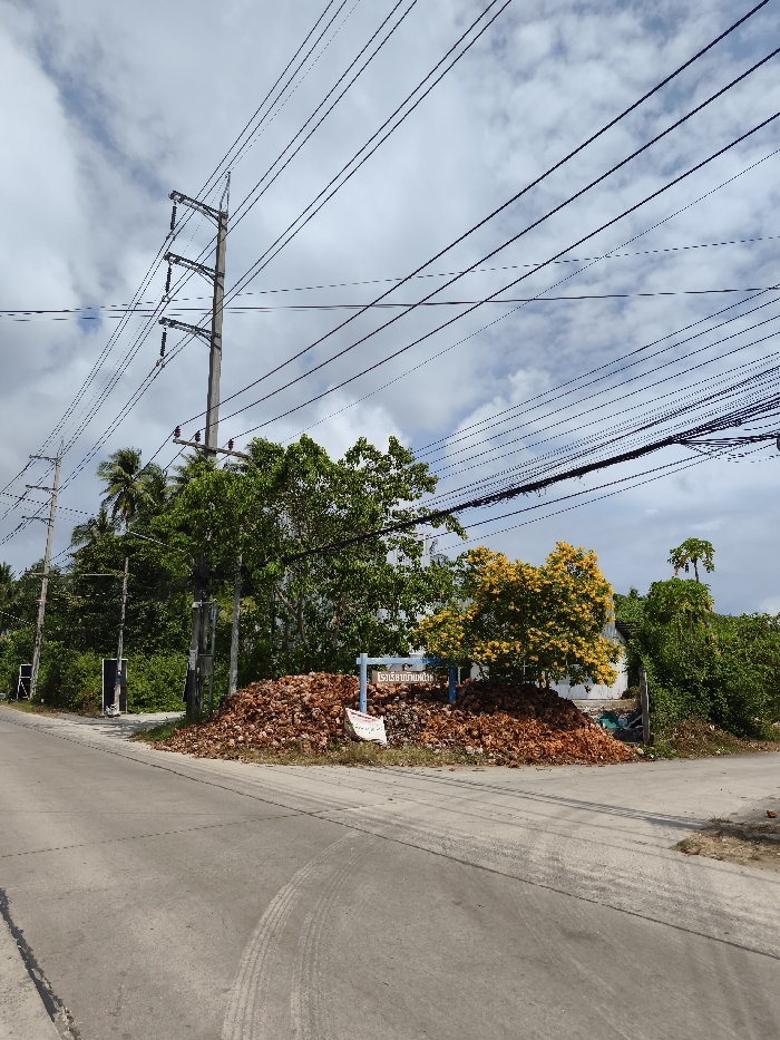 A low-angle shot depicts a rural scene with a paved road foreground. Overhead, numerous power lines stretch across a cloudy sky. On the roadside sits a sizable pile of brown, dried coconut husks, obscuring a blue sign with Thai script. Trees, some blooming with yellow flowers, surround the husk pile. Two utility poles are visible, adding to the overhead wire complexity.