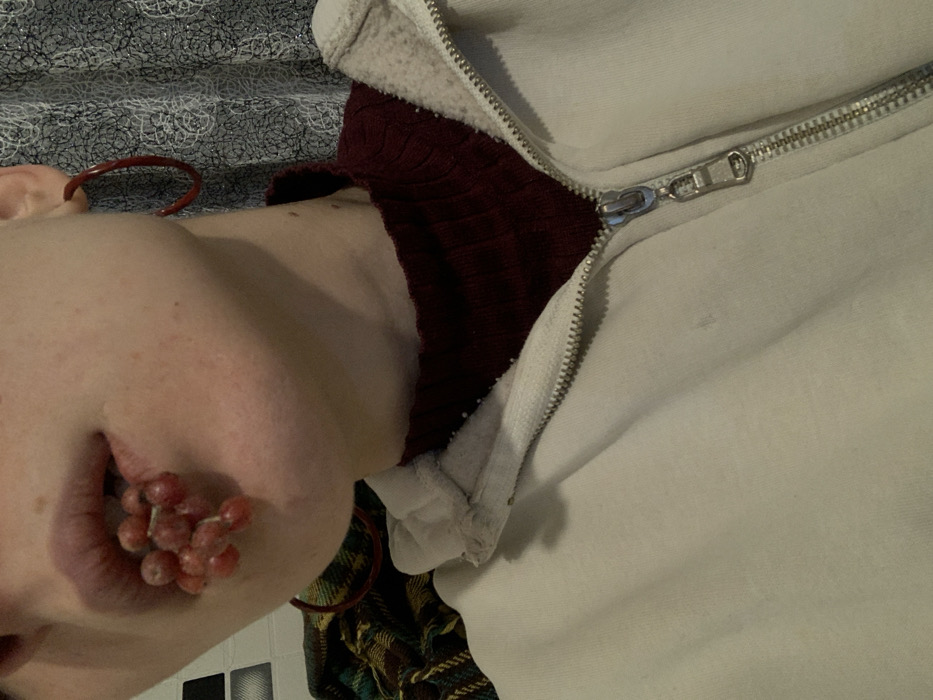 The scene is situated in the city of Debetavan, Armenia. The image depicts the upper body of an individual, cropped from the chest upwards, shown from a slightly elevated, oblique angle. A cluster of approximately ten small, light red berries, consistent with currants, is held between the individual's slightly parted lips and lower lip, with some stems visible. The individual has fair skin with scattered freckles on the chin and cheek. They are wearing a dark red, ribbed turtleneck shirt beneath a light-colored, possibly off-white or beige, zippered hoodie with the zipper partially open, revealing the undershirt. A dark red hoop earring is present on the individual's right earlobe. In the background, to the left, a portion of a patterned textile, possibly plaid in green and brown hues, is visible. To the right, behind the individual's head, a gray patterned curtain or fabric is visible.
