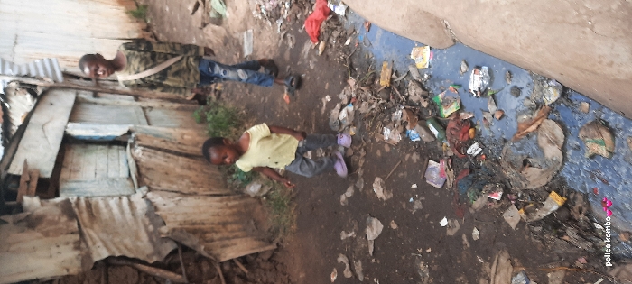 The image depicts a scene within an informal settlement in Nairobi, Kenya