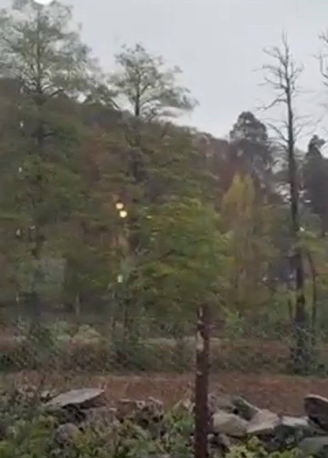 rainy day outside, filmed from indoors. A dark, slightly blurred wooden bench sits in the foreground on a wet patio. Behind the bench, a chain-link fence separates the patio from a hillside covered in green vegetation and rocks. The hillside leads up to a line of trees. Some trees have green leaves, while others are bare or showing hints of fall colors. A house is partially visible behind the trees. The sky is overcast and gray. A string of lights hangs above the fence, connected to a pole. Raindrops are visible on the window.