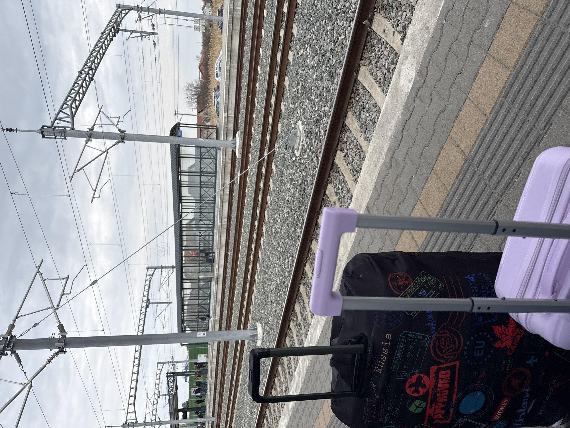 The image depicts a railway station platform in Petrovaradin, Serbia, under an overcast sky. In the immediate foreground, two pieces of luggage are positioned on a grey paver-covered platform with an integrated tactile strip. On the left, a black soft-shell suitcase displays various travel-themed stamp graphics including "Russia," "APPROVED," "VISA," "EU," "Canada," "Sydney," "Finland," and "Malaysia." Its black telescopic handle is extended. To its right, partially visible, is a light purple hard-shell suitcase with its grey telescopic handle also extended. Beyond the platform edge, multiple railway tracks traverse a bed of grey gravel ballast. Concrete sleepers are visible supporting the steel rails. A prominent grey metal mast with an intricate truss-like cantilever structure supports overhead electrification lines directly above the tracks. Another, less elaborate mast is visible further down the line. A small grey pole marked "48" stands between two track sets. Across the tracks, on an opposing platform, a group of approximately 10-15 individuals stands, waiting. This platform features a modern, elongated covered shelter with glass side panels and a dark roof. In the background, beyond the far tracks, an area of dry, tall grass or reeds is visible, followed by a line of parked cars (at least three light-colored vehicles) on an unpaved surface. Residential buildings with reddish-brown roofs are discernible against the distant horizon. The overall scene suggests a functional railway station environment with active passenger traffic.