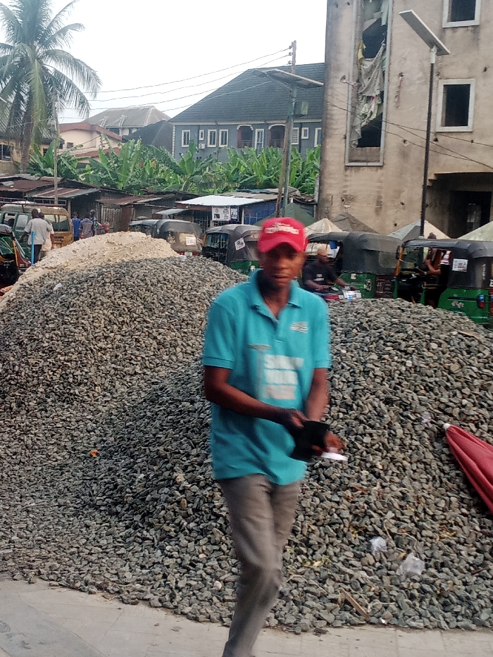 A man in a red cap and light blue shirt walks past large piles of gravel. He holds a black object in his hands, possibly a phone. In the background, there are green auto-rickshaws parked, buildings with banana trees growing around them, and a tall palm tree on the left. A street lamp and tattered fabric hanging from a building indicate urban life.