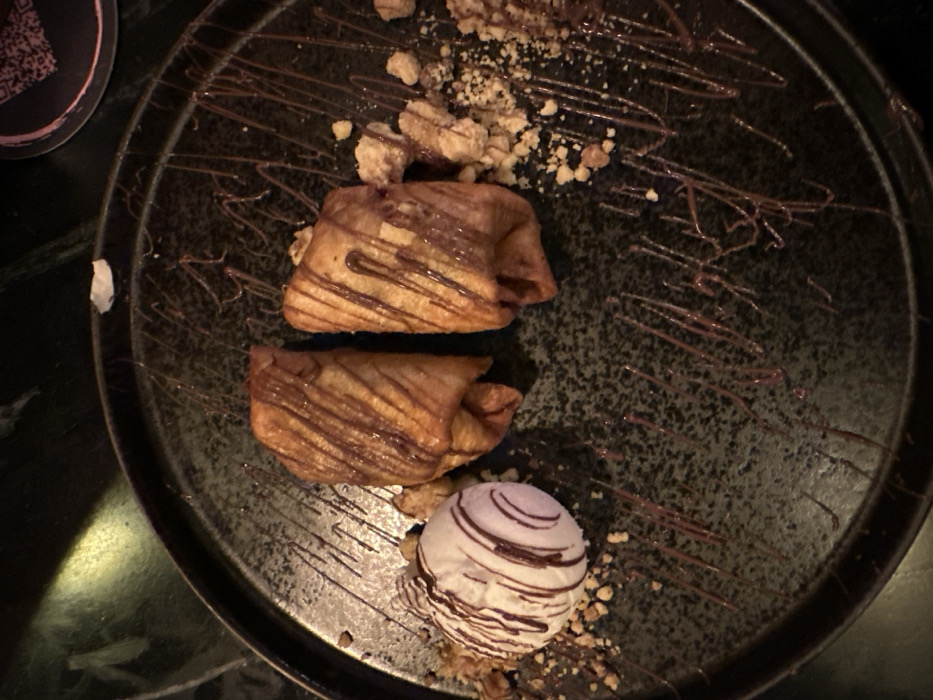 The image displays a dessert presented on a dark, round, textured plate with a raised rim, resting on a dark, glossy tabletop exhibiting subtle green veining. The dessert consists of two golden-brown, rolled or wrapped pastries, each diagonally drizzled with dark chocolate sauce. To the left of these pastries, a scoop of light-colored ice cream, appearing white with a faint lavender tint, is present, also adorned with dark chocolate drizzles. Scattered light-brown crumbs or crushed nuts accompany the ice cream and are partially visible near the pastries. The plate's surface is further decorated with irregular streaks of dark chocolate sauce. The overall lighting is dim, with a warm, localized yellow light source visible in the upper left background. A partial view of a black circular coaster, featuring a white QR code pattern, is discernible in the upper right background. The specific location within Alicante/Alacant, Spain, cannot be determined from the visual evidence provided. No individuals or direct actions are depicted.