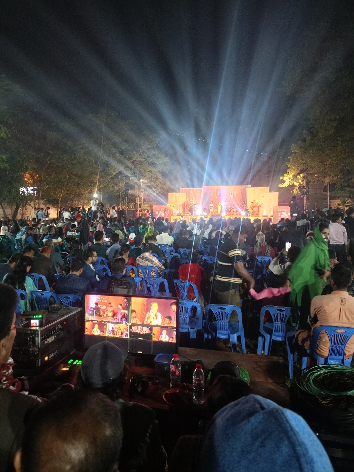 A large crowd gathers in an outdoor space at night, illuminated by bright stage lights. Many are seated in blue plastic chairs facing a stage where a performance is taking place. In the foreground, a monitor displays multiple camera angles of the ongoing performance. Cables, water bottles, and equipment suggest a live broadcasting setup. A few people are standing, some using their phones. Trees frame the scene in the background.