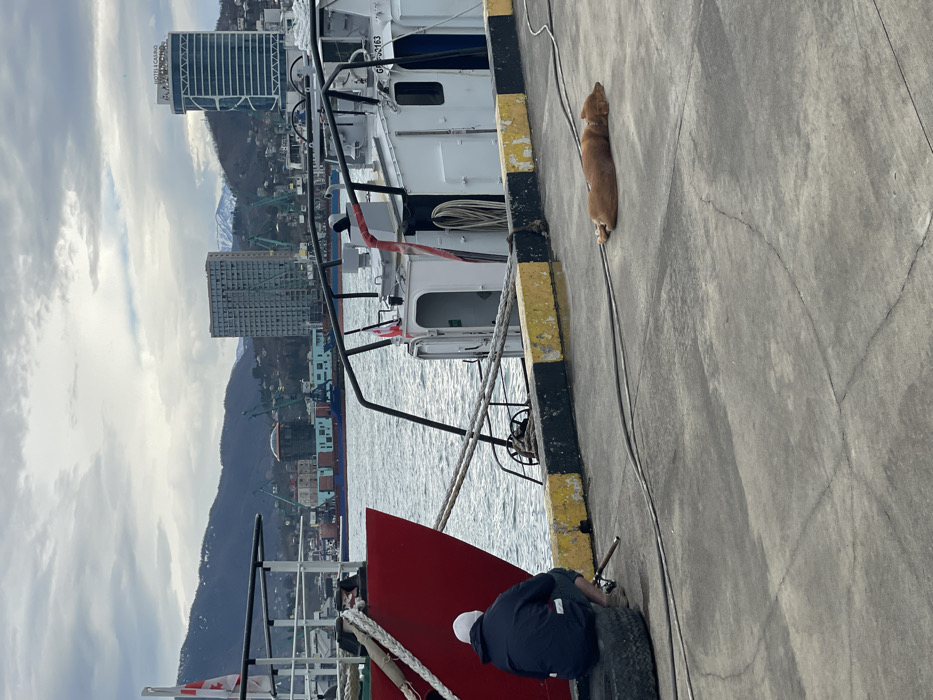 The scene depicts a section of the port in Batumi, Georgia, under an overcast sky. In the immediate foreground, a concrete pier is visible, featuring a yellow and black striped bumper along its edge. On the left side of the pier, a person is seated on a black tire, facing the water and a large red boat. The individual wears a dark jacket and a light-colored head covering. A fishing rod extends from their right side towards the water. The bow of the red boat is visible, secured to the pier by thick mooring ropes. A Georgian flag is affixed to a pole on the red boat. To the right of the person, a light brown dog lies prone and motionless on the concrete pier, appearing to be asleep. Two dark electrical or communication cables traverse the pier, one near the seated person and another closer to the dog. A white boat with black railings is docked adjacent to the red boat. A portion of its stern shows the registration number "G-62163," and a Georgian flag is visible on its deck. Beyond the docked boats, the Black Sea water extends towards the distant coastline. Industrial port infrastructure, including cranes and other vessels, is visible on the far side of the water. The city of Batumi forms the backdrop, characterized by multiple urban buildings, notably a tall, curved glass high-rise identified as "HOTEL & CASINO PLAZA BATUMI." Green hills and snow-capped mountains rise in the far distance beneath the cloudy sky.