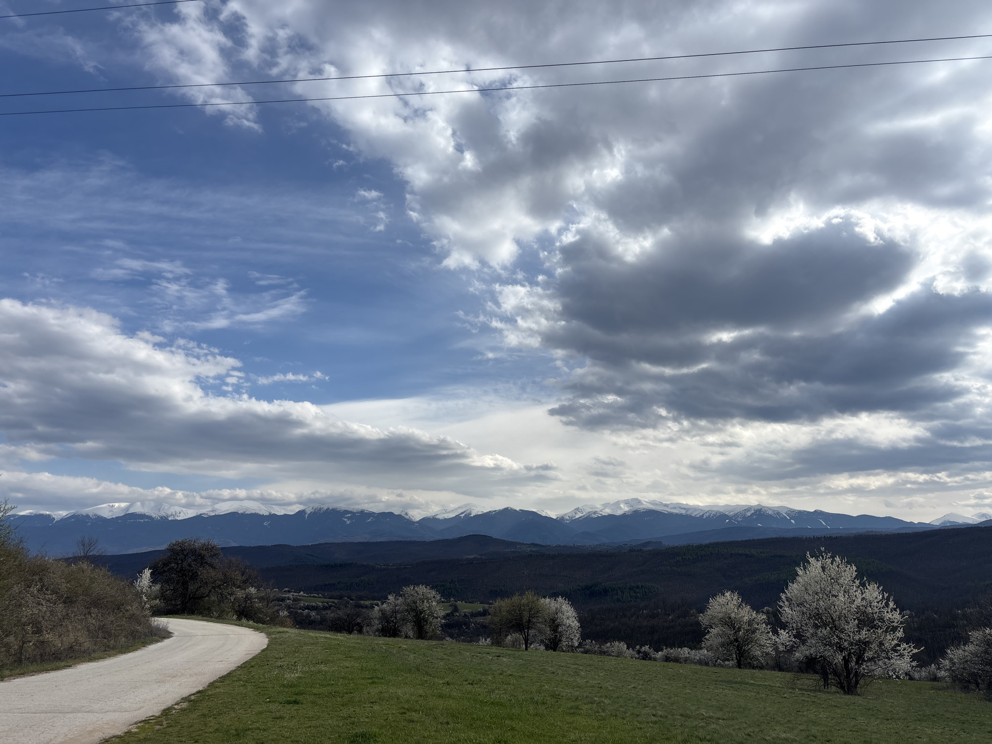 A landscape scene in Ochusha, Bulgaria. A curved dirt road leads into the distance, framed by a green grassy hill on the right and trees on the left. Several flowering trees with white blossoms dot the hillside. In the background, a dark, forested range of hills leads to a mountain range capped with snow. Above the mountains, the sky is filled with a mixture of blue sky and heavy gray clouds. Power lines are visible across the top of the frame.