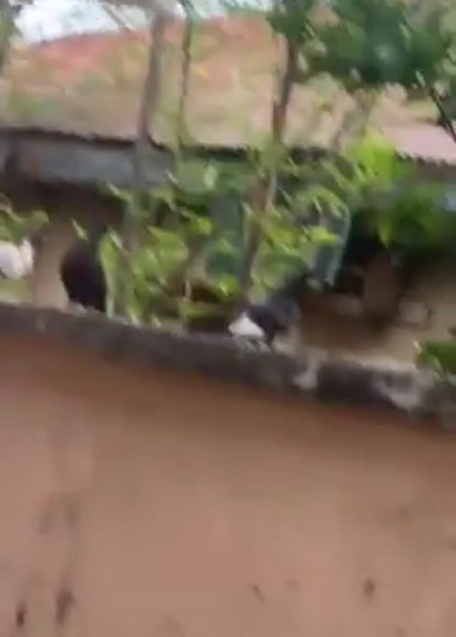medium-shot of three pigeons standing on a weathered wall. Behind the wall are various plants and a corrugated metal roof. One of the pigeons takes flight and flies into the branches of a tree. The camera angles up to focus on the tree canopy and the sky visible through the branches.