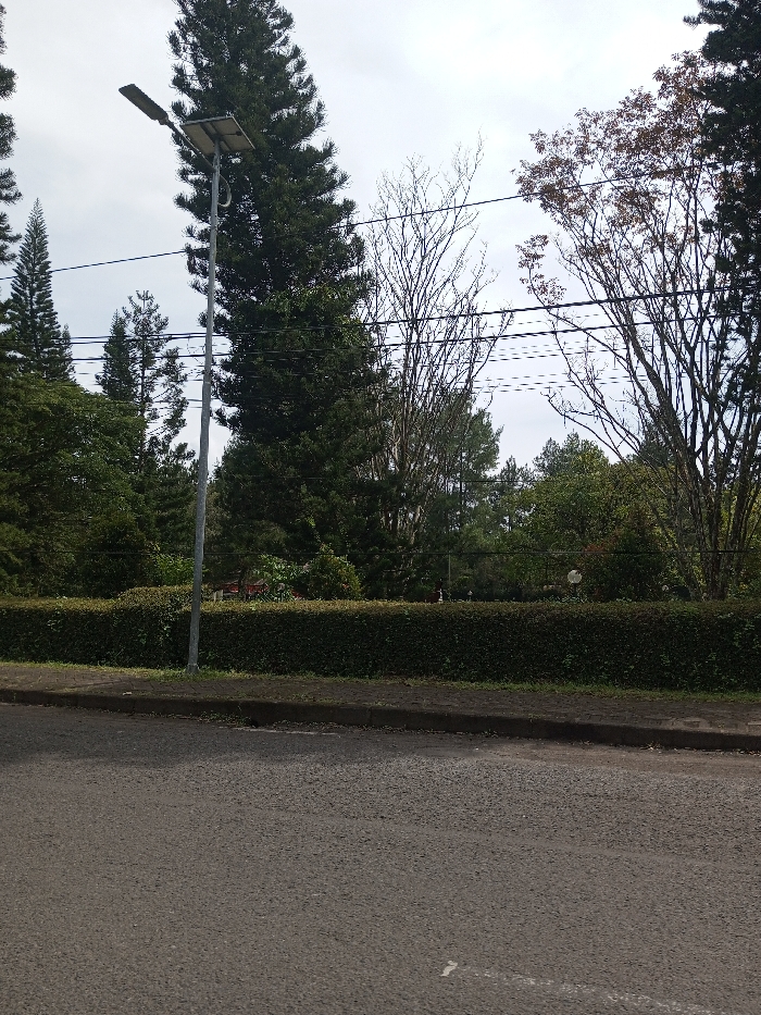The scene depicts an outdoor environment in the city of Namthoung, Laos, under an overcast sky. In the foreground, a dark gray asphalt road with a visible curb separates it from a vegetated area. A tall, slender gray metal pole, positioned slightly left of center, rises from the curb line, supporting a street light fixture with an attached solar panel at its apex. Behind the curb, a uniformly trimmed, dense, dark green hedge extends horizontally across the image. Behind the hedge, various trees and shrubs are present, including several tall, dark green conifer-like trees on the left and center, and deciduous trees with bare branches or sparse foliage on the right. Multiple dark utility lines stretch horizontally across the upper mid-ground. Partially visible behind the hedge and foliage are a red structural element towards the left-center and a distinct white circular object towards the right. No individuals or animals are visible.