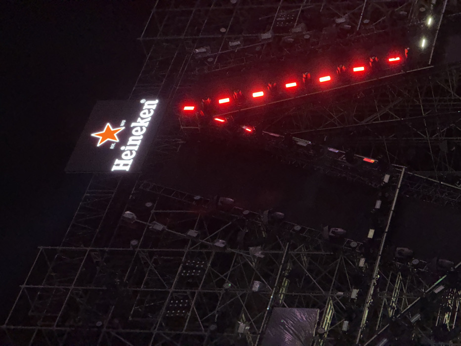 The image depicts a large, illuminated outdoor stage or event structure at night in Nha Trang, Vietnam. Centrally positioned at the top of the structure is a brightly lit "Heineken" logo, featuring white text, an orange five-pointed star, and "EST. 1873" against a dark rectangular panel. The logo is mounted on an extensive framework of dark metal scaffolding or trussing. A prominent vertical array of approximately nine bright red rectangular lights descends along the right side of the structure. The left side of the scaffolding also contains multiple white spotlights and grids of smaller white lights, with a dark, possibly covered screen or banner visible in the lower-left quadrant. The sky is dark, indicating nighttime conditions. No individuals are visible in the scene.