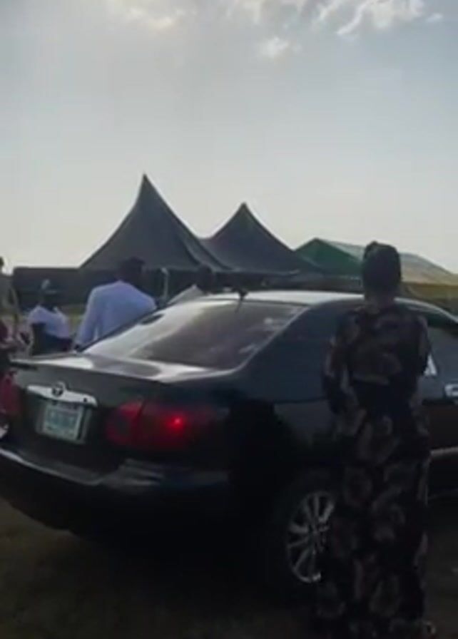 A woman in a long black floral dress enters the back seat of a black Toyota sedan parked in a grassy field. The car has a government license plate. In the background, there are several black tents and a few small buildings. The sky is overcast with a bright sun breaking through the clouds. Other people are visible near the tents.
