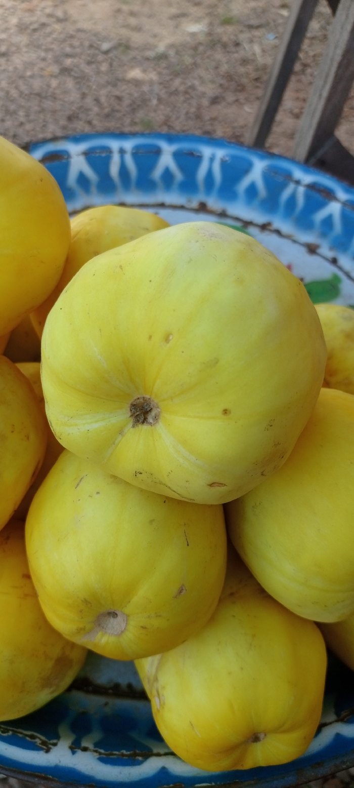- "A close-up, high-angle view depicts a pile of numerous ripe, bright yellow, oblong-shaped melons resting within a weathered blue and white enamelware tray" by FM-TtcGJ3, licensed under CC BY 4.0