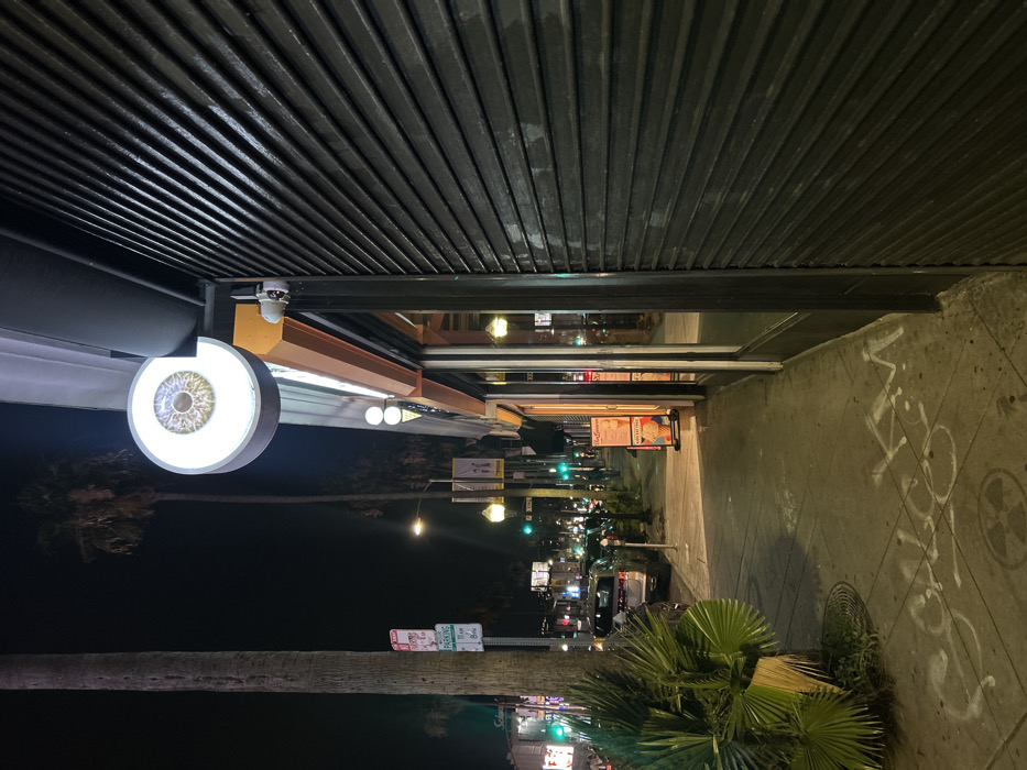 A nighttime street scene shows a sidewalk beside a building with a closed, corrugated metal security shutter. An illuminated, circular sign with an eye graphic hangs from the building's awning. Streetlights, traffic signals, and distant buildings punctuate the darkness along the road. Palm trees and other greenery are visible along the sidewalk edge. A palm tree trunk and parking signs are visible in the background. Graffiti marks the sidewalk.