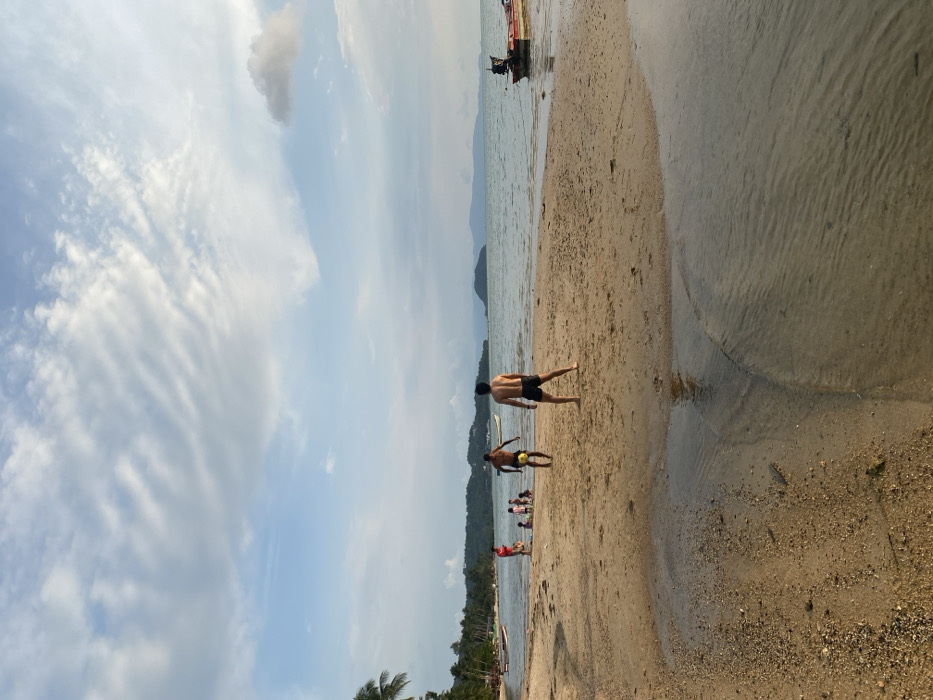 The image displays a daylight scene on a sandy beach at Baan Sri Thanu, Thailand