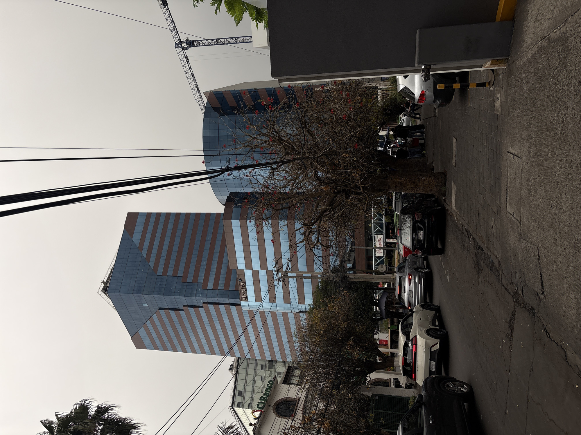 street scene in Mexico City, Mexico. Two tall, modern office buildings with glass and brown horizontal stripes are visible in the background. A construction crane stands near the top of the buildings. Power lines run diagonally across the upper left portion of the frame. A tree with bare branches, save for a few red flowers, partially obscures the view of the buildings. The street is lined with parked cars, mostly in shades of white, gray, and black. There is a sidewalk on the right side of the image with a yellow curb. A building with a sign that reads "CiBanco" is partially visible at the bottom of the frame. The sky is overcast.