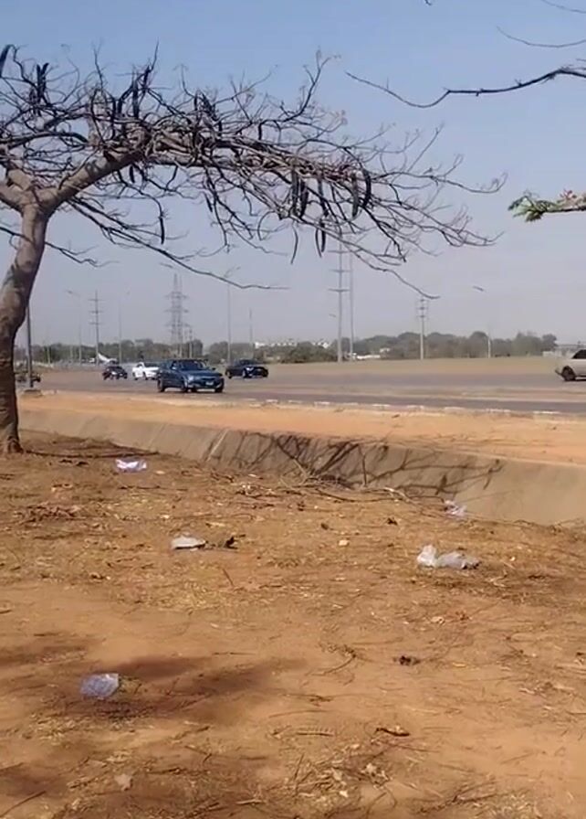 view of a busy road from a dirt area with a tree branch obstructing some of the view. The road has several cars, SUVs, and a motorcycle traveling on it in both directions. Power lines are visible in the distance. There's trash strewn on the dirt area in the foreground. The sky is blue.