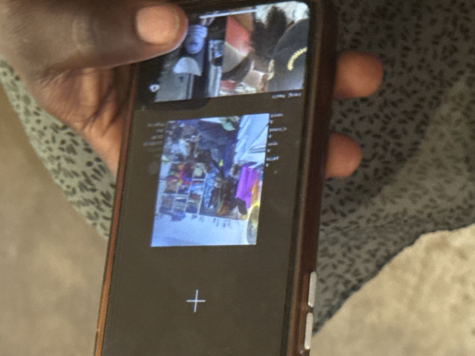 A dark-skinned human hand is captured in a close-up, holding a smartphone horizontally. The smartphone is encased in a dark reddish-brown protective cover, revealing light-colored buttons on its left side. The phone's illuminated screen displays a primary, larger image on the left and a smaller, blurred thumbnail preview on the right. The primary image on the screen depicts an indoor market or shop scene in Jos, Nigeria. Within this scene, multiple individuals are discernible, some standing, surrounded by shelves densely packed with various colorful textiles and other merchandise. A person in the foreground of the screen's main image is positioned near a bright purple fabric. A white crosshair symbol is overlaid on the upper-left quadrant of this screen display. The smaller thumbnail preview on the right shows another interior scene, with a partially visible individual displaying dark, curly hair. The hand's thumb rests on the right edge of the phone's screen, and three fingers are curled underneath the device. The background behind the phone consists of a textured, mottled gray and black fabric, possibly upholstery, with a segment of lighter beige fabric visible in the lower-left corner of the overall image.