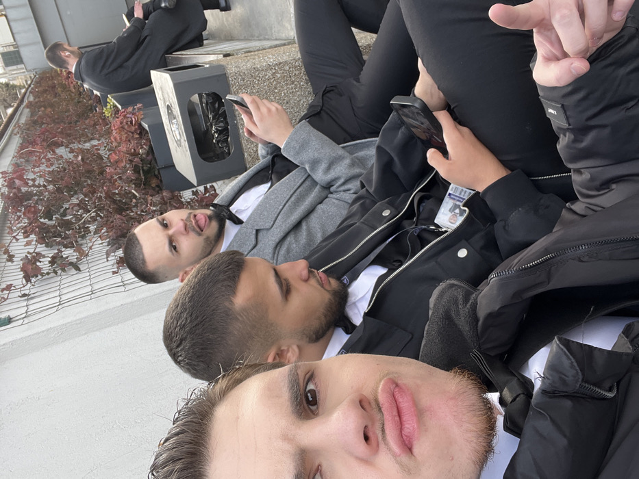 An outdoor scene in Sofia, Bulgaria, depicts four males seated on a concrete or stone bench in apparent daylight, likely in the vicinity of the National Palace of Culture (NDK) during a "Digital K" event, suggested by an identifiable badge. In the foreground, a young male, appearing to take a selfie, looks directly at the camera with pursed lips. He has light stubble, dark hair styled upwards, and wears a black puffer jacket over a white shirt and a black bow tie. Adjacent to him, a second young male with a short fade haircut and stubble beard is observed looking down at a black smartphone held in his hands. He wears a black zipped jacket over a white shirt and a black bow tie, with an "DIGITAL K SOFIA" identification badge hanging from his neck. To his right, a third young male with a short fade haircut and goatee looks towards the camera with his tongue slightly extended. He wears a grey blazer over a white shirt and a black bow tie, with black trousers, and is also engrossed in a black smartphone held in his hands. Further in the background, to the right, a fourth male with dark hair is seated with his back mostly to the viewer, wearing a dark, possibly black, long coat. He is looking downwards, focused on an object not clearly visible. The immediate background consists of a white wall adorned with climbing plants displaying reddish-brown, autumnal foliage. A black rectangular outdoor trash receptacle, containing a black plastic bag, is situated between the second and third males. The ground appears to be paved, and the lighting indicates a clear, bright day.