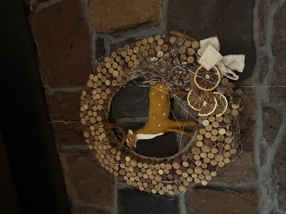 Located in Yerevan, Armenia, the image depicts a circular decorative wreath centrally mounted on a rustic stone wall. The wreath is primarily composed of numerous light and dark wine corks arranged horizontally. Inside the wreath, a light brown deer figurine with white spots and antlers is positioned, facing left. The wreath is further embellished with intertwined string lights, several dried orange slices, cinnamon sticks, small pinecones, and dried twigs. A beige fabric bow is attached to the lower right perimeter. The background wall consists of irregular reddish-brown and dark grey stones set with lighter mortar. A dark, horizontal structural element is visible at the top of the frame.