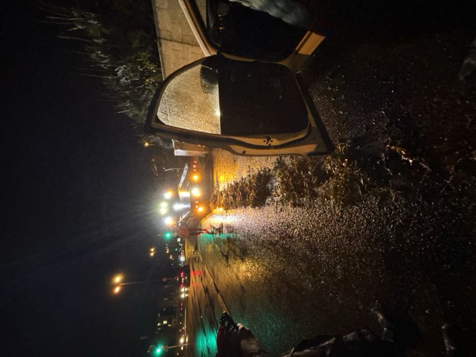 At night, a car door is ajar, its window reflecting light. The road surface is wet, reflecting streetlights and vehicle lights. A tow truck with flashing lights is present, indicating a roadside assistance situation. Vegetation is visible near the road. Traffic lights and other vehicles are visible in the distance. The scene suggests a car breakdown or accident on a wet night.