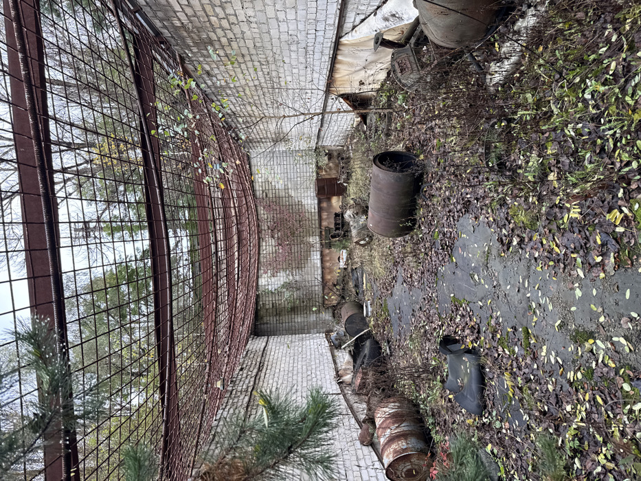 This image depicts the interior of a disused sports facility in Prypiat, Ukraine, characterized by advanced urban decay and extensive overgrowth. The scene is observed from a slightly elevated vantage point, looking into a rectangular enclosure. The structure features white brick walls on three visible sides, with the paint or facade extensively peeled and discolored by water stains and biological growth, particularly near the base. A heavily rusted, fine-mesh metal netting, supported by larger, equally rusted metal beams, forms a partial, sagging roof overhead. This mesh structure is significantly damaged and warped, with segments collapsed inwards, revealing an overcast sky and the bare branches of deciduous trees beyond. Pine needles are visible in the upper left foreground, protruding into the frame. The ground consists of a central, cracked concrete pathway, flanked by heavily overgrown areas of exposed soil. These areas are thickly covered with a layer of brown and yellow fallen leaves, indicative of autumn conditions, along with various weeds, grasses, and small saplings growing directly from the ground. Scattered throughout the overgrown sections are numerous industrial-sized metal barrels, heavily rusted and some lying on their sides. At least eight such barrels are clearly visible, particularly along the left wall and in the mid-ground. Other unidentified pieces of metallic debris and discarded objects are partially obscured by the vegetation. A small, slender deciduous tree sapling grows near the right wall in the mid-ground. No people or animals are present in the scene. The overall environment conveys a sense of abandonment and nature reclaiming a man-made structure.