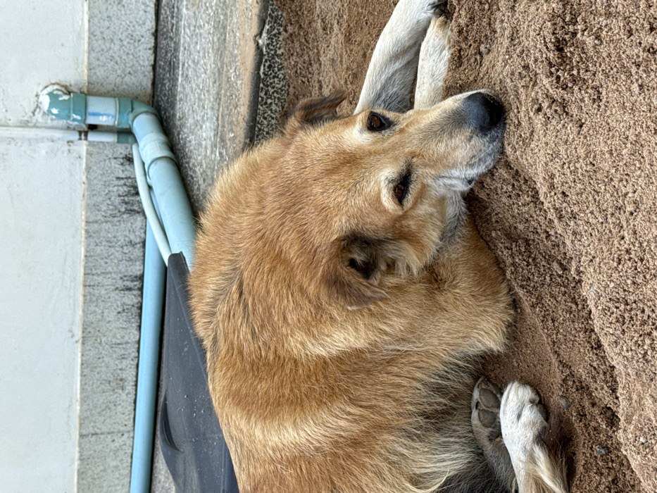 - "A medium-sized dog with tan and brown fur lies curled on a pile of tan sand" by FM-G5k3Y2, licensed under CC BY 4.0