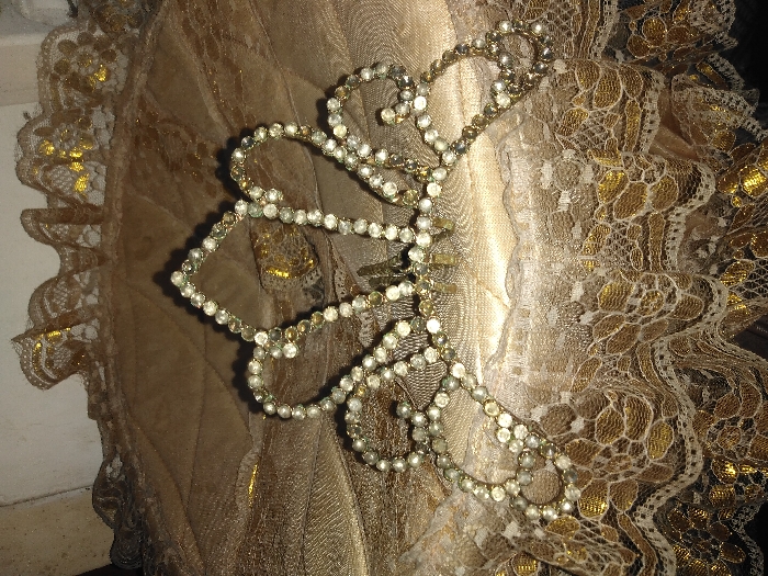 A silver-toned tiara, adorned with numerous clear, faceted stones, rests centrally on a layered surface. The tiara displays an ornate design with multiple looping and heart-shaped elements, culminating in a central peak. It casts a distinct shadow onto the surface beneath, indicating illumination from an upper light source. The immediate resting surface consists of a quilted, shimmering gold-beige fabric, possibly velvet. Beneath and around the tiara, extensively ruffled gold-and-beige lace fabric is visible, featuring intricate patterns and a lustrous quality. No individuals, actions, or specific environmental markers indicating a city location are present within the frame.