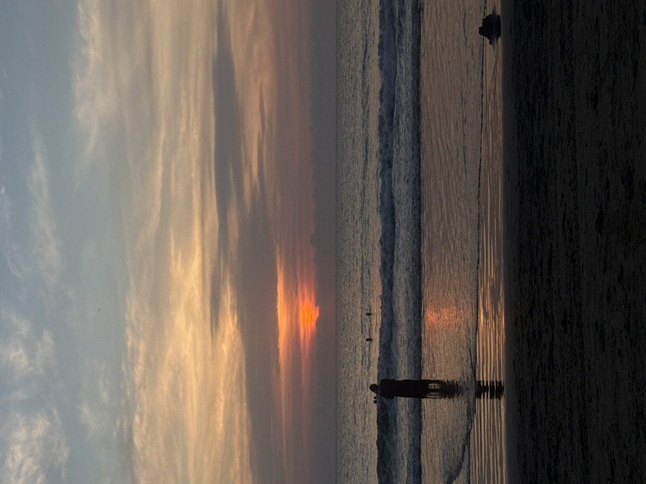 A sideways view captures a beach at sunset. The sky transitions from light blue to fiery orange, reflected in the ocean waves. Silhouettes of people dot the shoreline, their forms stark against the shimmering water. The sand stretches into darkness on the right, contrasting with the vibrant hues of the sky and sea.