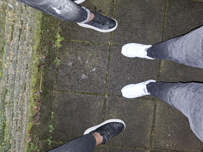 Three individuals are observed standing on a dark grey paved surface consisting of rectangular concrete tiles, located in Veliki Preslav, Bulgaria. The paving exhibits dirt, wear, and green moss with small plants growing in the tile seams. At the top of the frame, a textured wall, possibly stone or concrete blocks, is visible, also covered in green moss and some vegetation. Details of the individuals: 1. **Subject 1 (Bottom of frame):** Wears dark grey distressed jeans and white athletic shoes. 2. **Subject 2 (Left side):** Wears dark grey or black jeans and black low-top sneakers with white soles. 3. **Subject 3 (Right side):** Wears dark grey distressed jeans and black low-top sneakers with white soles. The perspective is a top-down view, primarily focusing on the feet and the immediate ground environment. The lighting suggests an outdoor setting, potentially overcast or dim. No specific actions beyond standing are depicted.