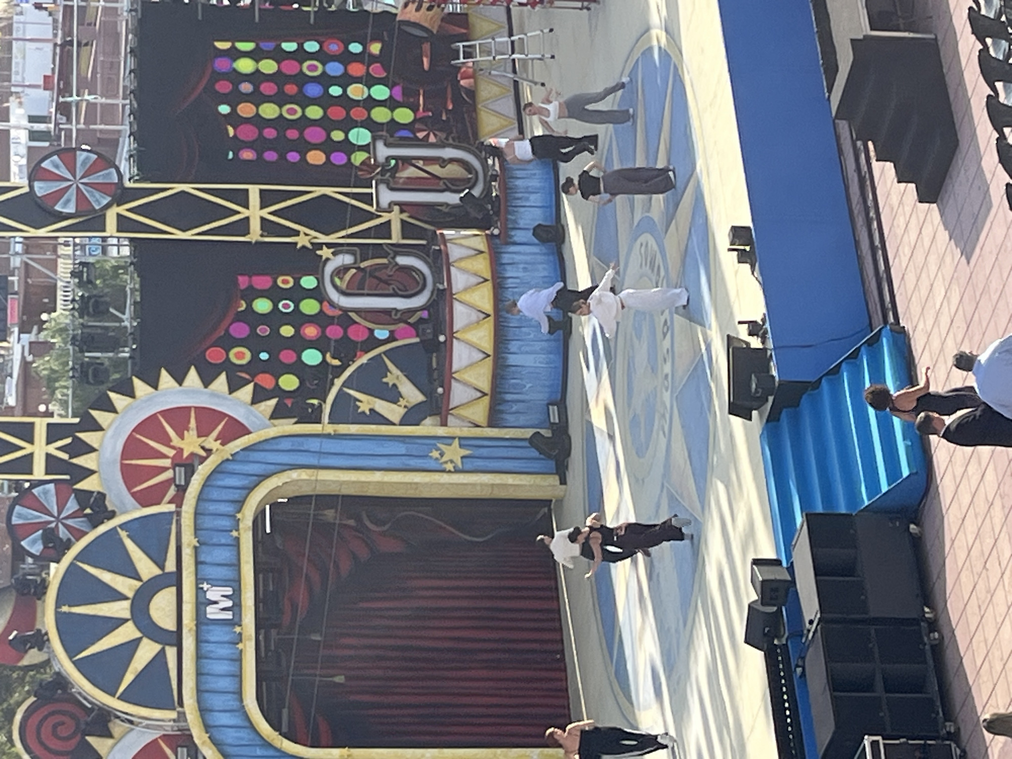 An outdoor event stage in Playa Del Inglés, Spain, is depicted from an elevated perspective under clear daylight. The stage presents a circus or carnival theme, featuring a theatrical backdrop with large, stylized pinwheels, gears, and arched structures in blue, yellow, red, and black. A central blue and yellow archway, marked with "M+" and stars, reveals a red curtain. The right side of the stage structure displays large silver letters "C" and "U" amidst panels of colorful circular lights. A silver step ladder is positioned on the far right. The light blue stage floor features a large, darker blue geometric pattern. Seven individuals are active on the stage. Five females and two males appear to be rehearsing or performing a dance. One female in a white top and white pants holds her arms outstretched. Another female, in a black top and dark pants, stands with hands on hips. A male in a white shirt and dark pants moves left. A female in a dark top and dark pants dances with another male in a white shirt and dark pants. A female in a white top and grey pants steps right. A female in a black off-shoulder top and black pants walks off stage left. The stage's front edge features black speaker stacks on wheeled platforms. Blue-covered stairs provide access to the stage on the left, and black-covered stairs on the right. A blue barrier separates the stage from the paved ground area. Several partially visible individuals, including one in a dark dress and others in casual attire, are present on the light-colored tiled ground below the stage.