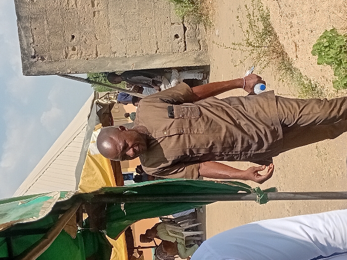 A man in a brown shirt and pants stands in an outdoor setting. He holds a water bottle in his right hand. Other people are visible in the background. The setting includes a partially visible building with a rough exterior and some vegetation. An awning or canopy provides shade in the foreground, partly obscuring the view.