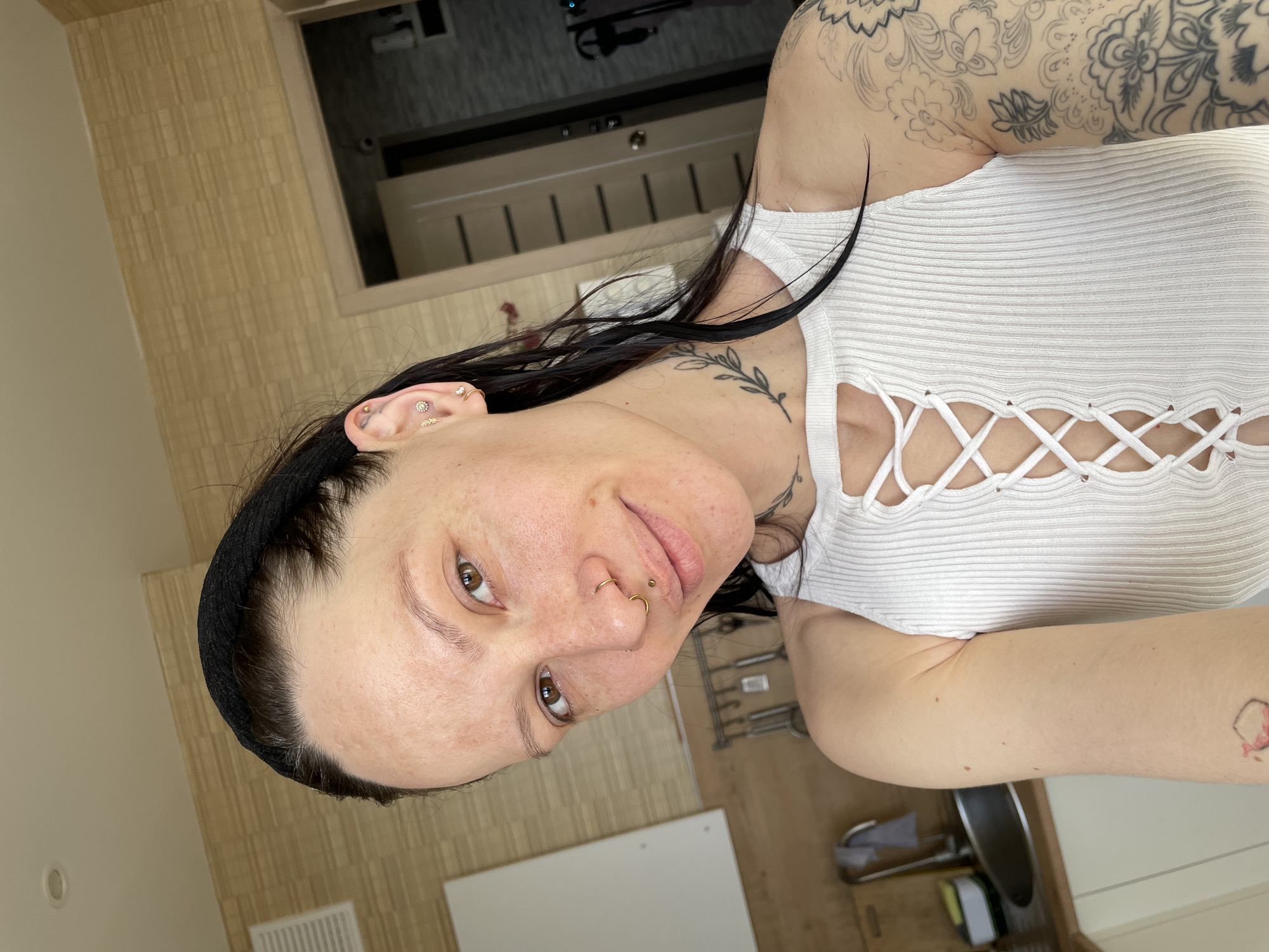 A woman with pierced ears, nose, and a lip piercing is wearing a white top