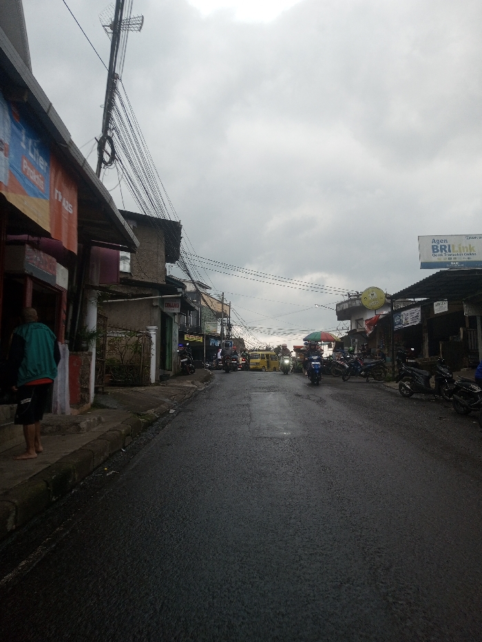 This image depicts a street scene in the city of Tangsibi, Bhutan. The outdoor setting is characterized by an asphalt road, appearing damp or wet, under a densely overcast sky. The view, captured from a low vantage point, extends down a narrow road flanked by multi-story commercial buildings. On the left foreground, a person wearing a teal/green jacket and dark shorts, appearing barefoot, stands on a concrete sidewalk. This sidewalk runs adjacent to a building with an orange and red facade, displaying partially legible text including "1 Liter Praktis" and "TVS". A dense network of black utility wires is strung across numerous poles and between buildings, with a prominent utility pole heavily laden with wires on the left side against the sky. Further down the left, additional buildings exhibit various construction styles, with some showing signs like "DIMANG". On the right side of the road, a series of structures and parked motorcycles line the street. A large blue and white billboard is prominently displayed on the upper right, featuring the text "Agen BRI Link" and "Bank Transfer Online". Multiple vehicles are present on the road: a blue motorcycle with a rider is visible in the mid-frame, and a yellow minivan with illuminated headlights is further in the background, amidst other motorcycles and what appears to be a vendor's stall with a green and white umbrella. The road itself is dark and textured, indicating a well-used thoroughfare.