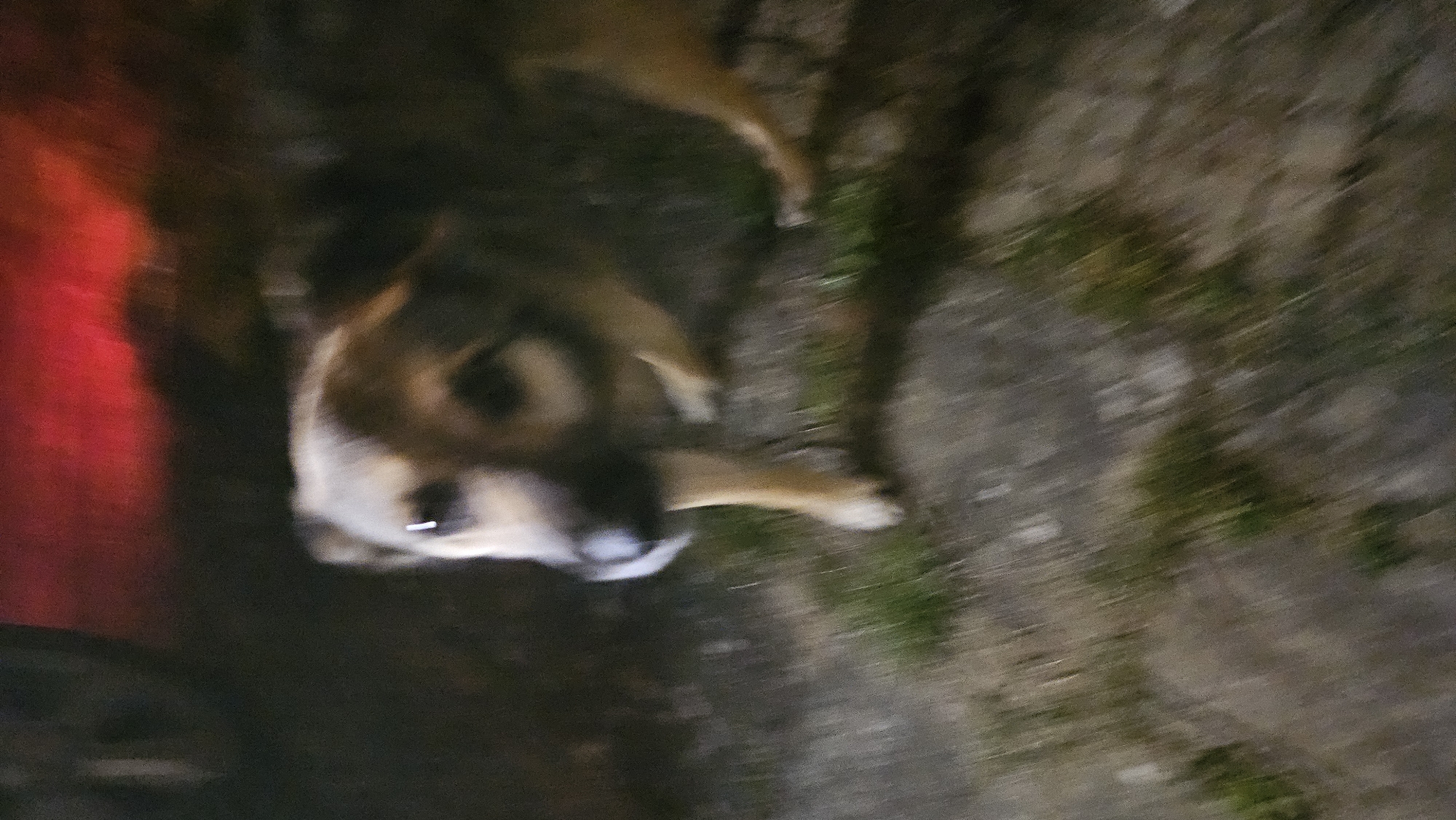 A blurry image of a dog, possibly a German Shepherd mix, standing on a dirt and grass area. The dog's head is turned toward the camera. A red object is visible on the left side of the frame. The location is unknown.