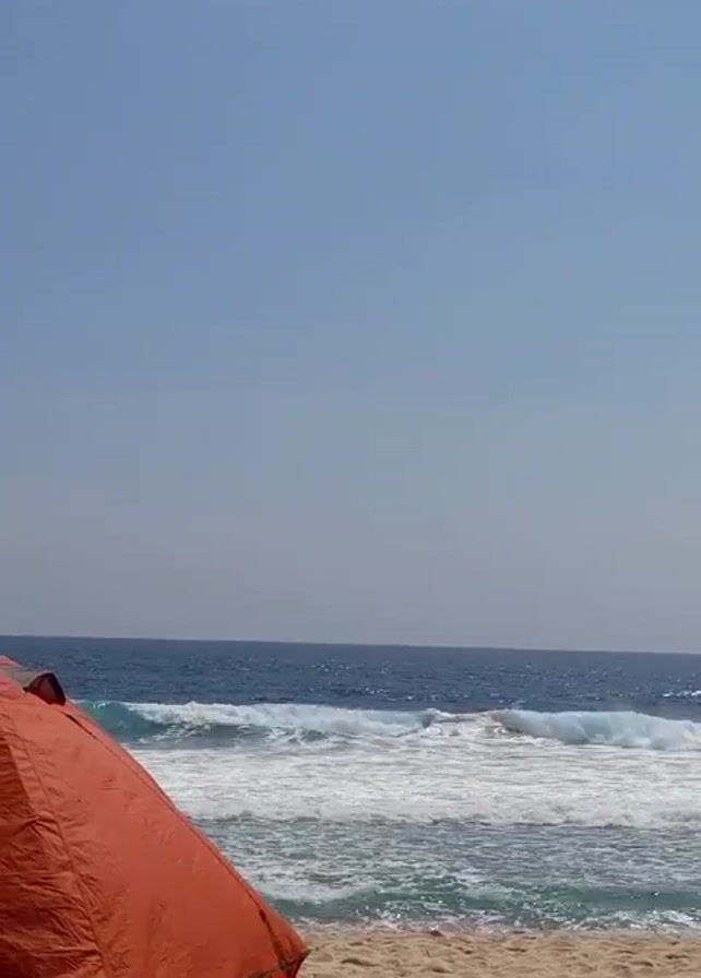 An orange tent sits on a sandy beach, with the ocean visible in the background. Waves are rolling onto the shore, and the sky is clear and blue. The camera is stationary and the scene is quiet. A few strands of palm fronds hang in the upper right corner of the frame.